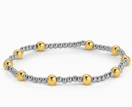 This bracelet is a must-have for its effortlessly cool style and comfortable wear. The two-tone beads create a lively display, perfectly accented by the 18K gold and rhodium plated brass beads for a sophisticated touch. Its stretch fit ensures comfort for all-day wear. This makes it an ideal jewelry gift for anyone who loves two-tone bracelets, stackable jewelry, or unique beaded accessories. Set/12 Stretch Bracelets 3mm and 5mm Beads 18k Gold and Rhodium Plated Brass Base