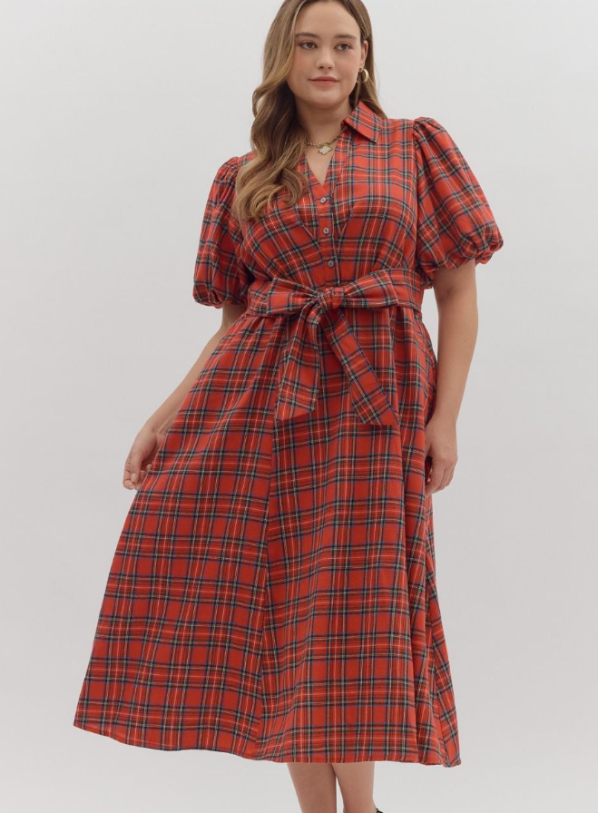 Plaid puff sleeve midi dress featuring self-tie waist belt and button closure at front. Side pockets. Lined. Woven. Non-sheer. Medium weight.