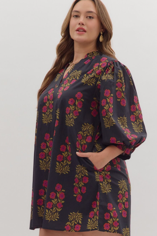 Floral pattern V-neck band collar mini dress featuring ¾ band puff sleeves. Side pockets. Lined. Woven. Non-sheer. Lightweight.