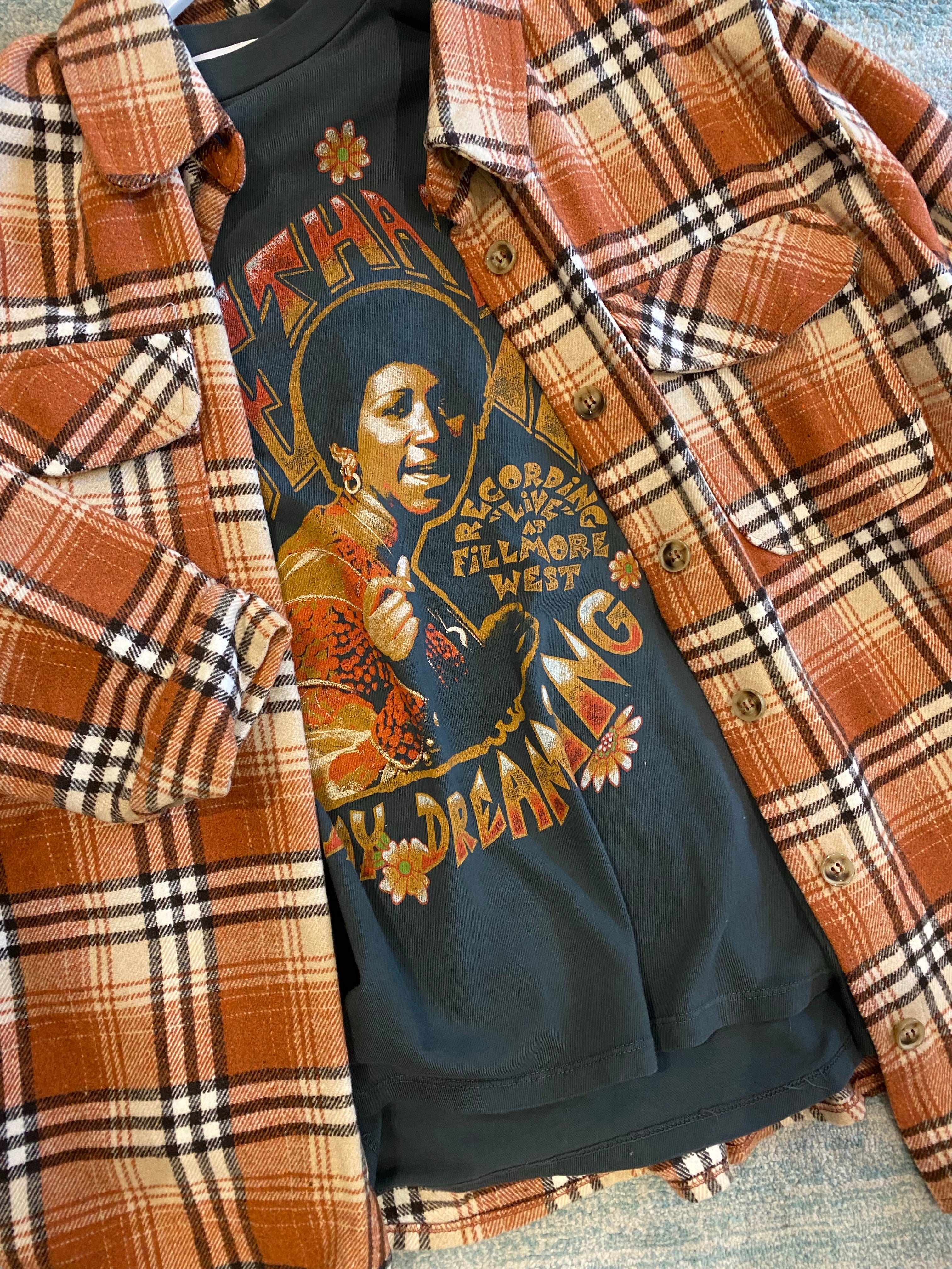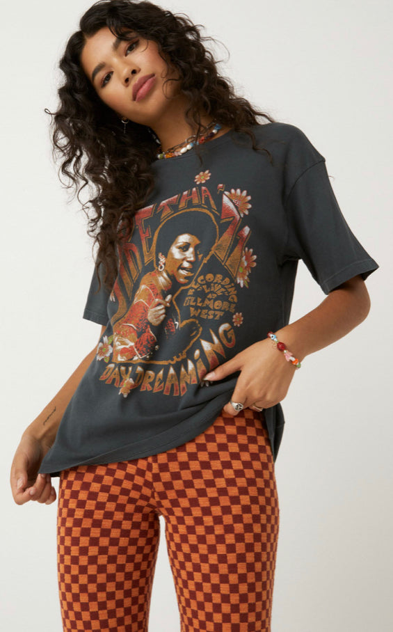 When the Queen of Soul dropped yet another hit, it was one we couldn’t help but gravitate toward: “Daydreaming.” With a title that touched us to the core, Aretha’s soul single, since covered by countless great acts, now lands on our latest weekend tee. Featuring a portrait of the 18 time Grammy winner, it’s only right that Aretha’s tee is designed in rich colors to match its soulful roots.