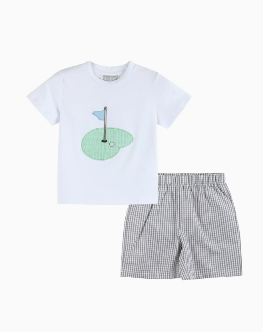 He’ll be ready to ace the style game in this Gray Gingham Golf Hole Shirt & Shorts Set. Features a fun golf appliqué and is made in soft 100% cotton to ensure he is comfortable all day long. This set is perfect for hitting the green or the playground. Upgrade his wardrobe with this hole-in-one style!