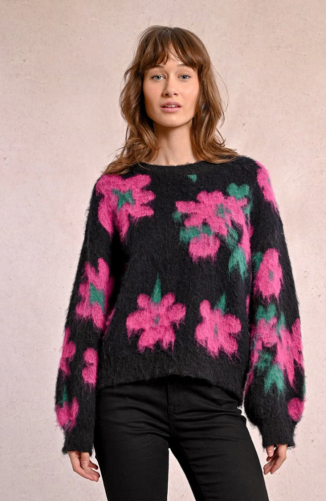 Soft knit sweater-Long, slightly puffed sleeves-Drop shoulder-Round neckline (close to the neck)-Brushed finish.-Floral print
