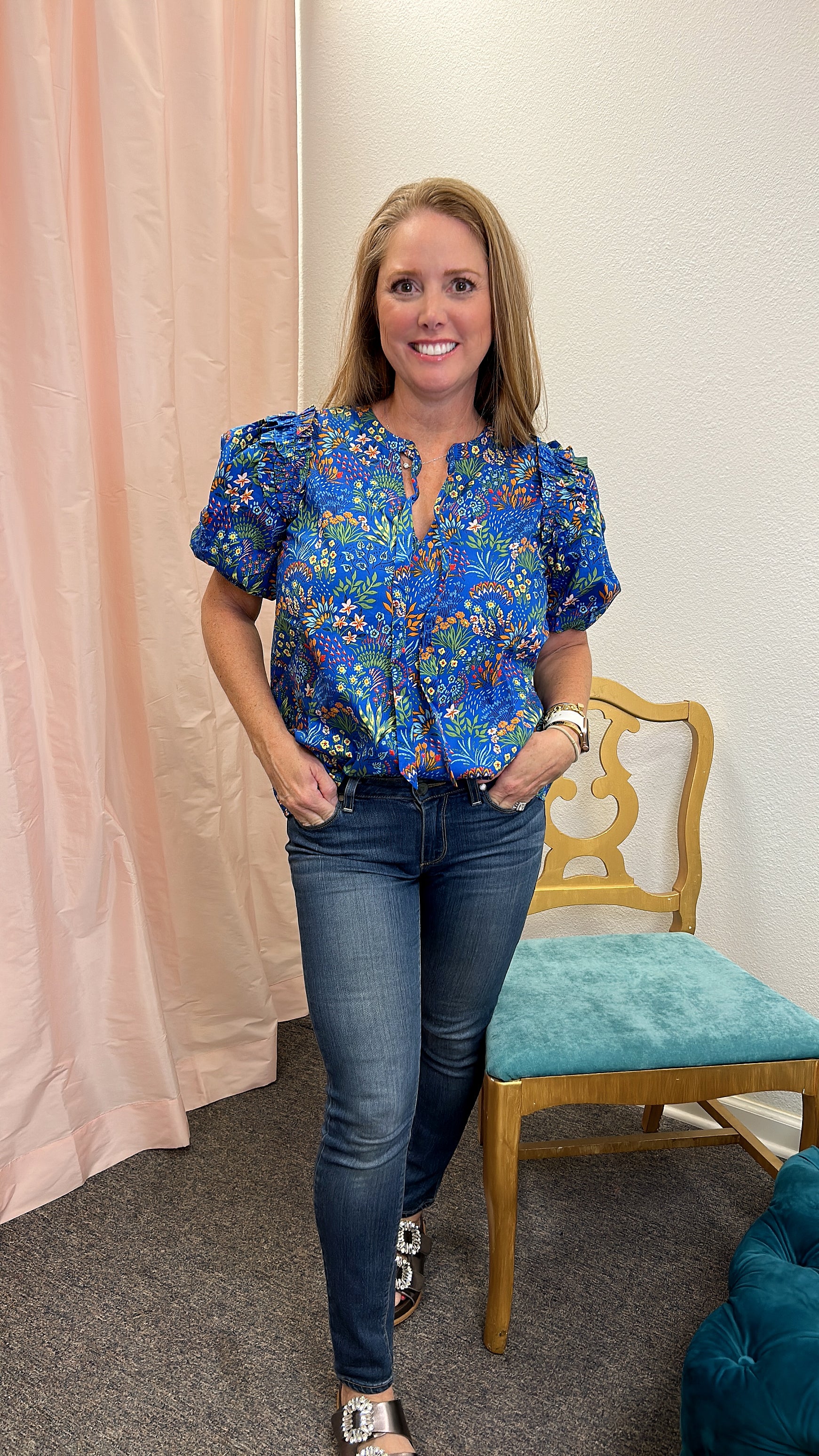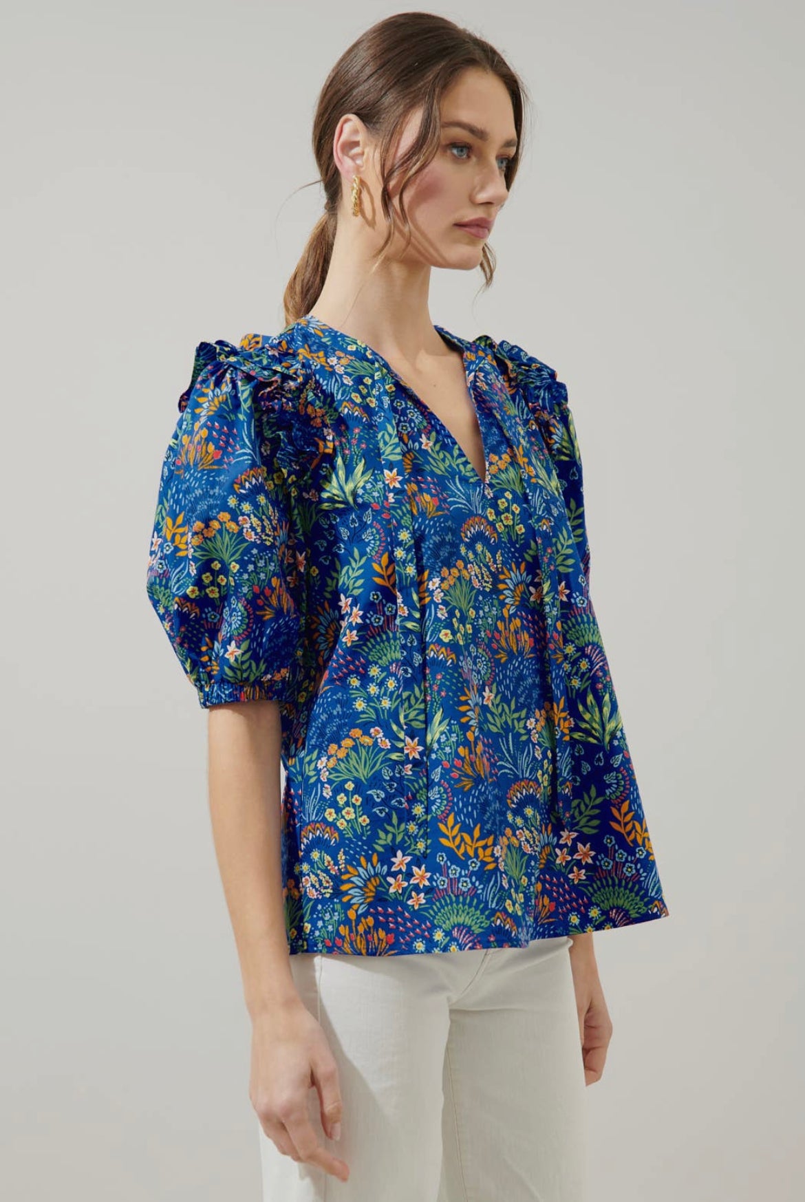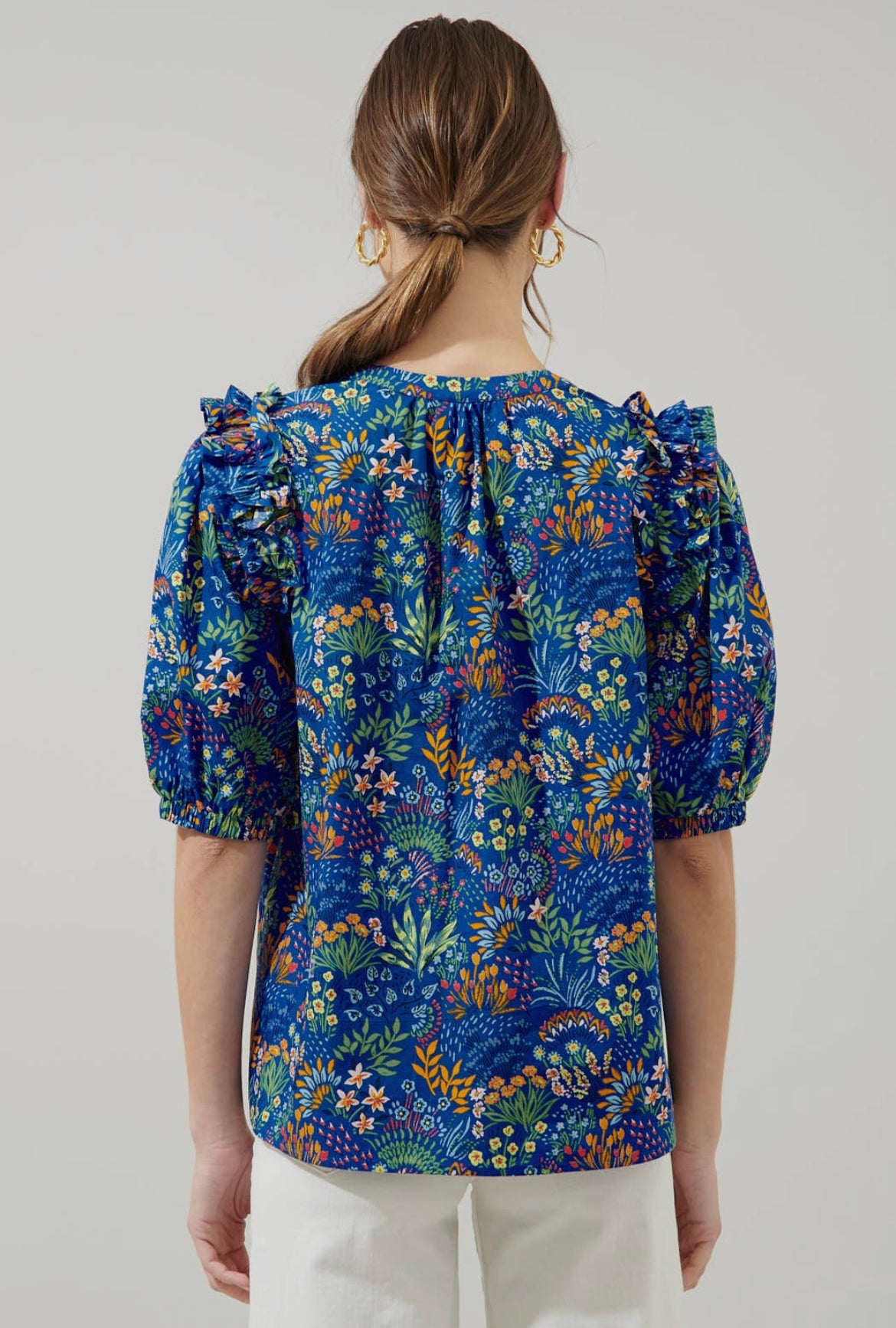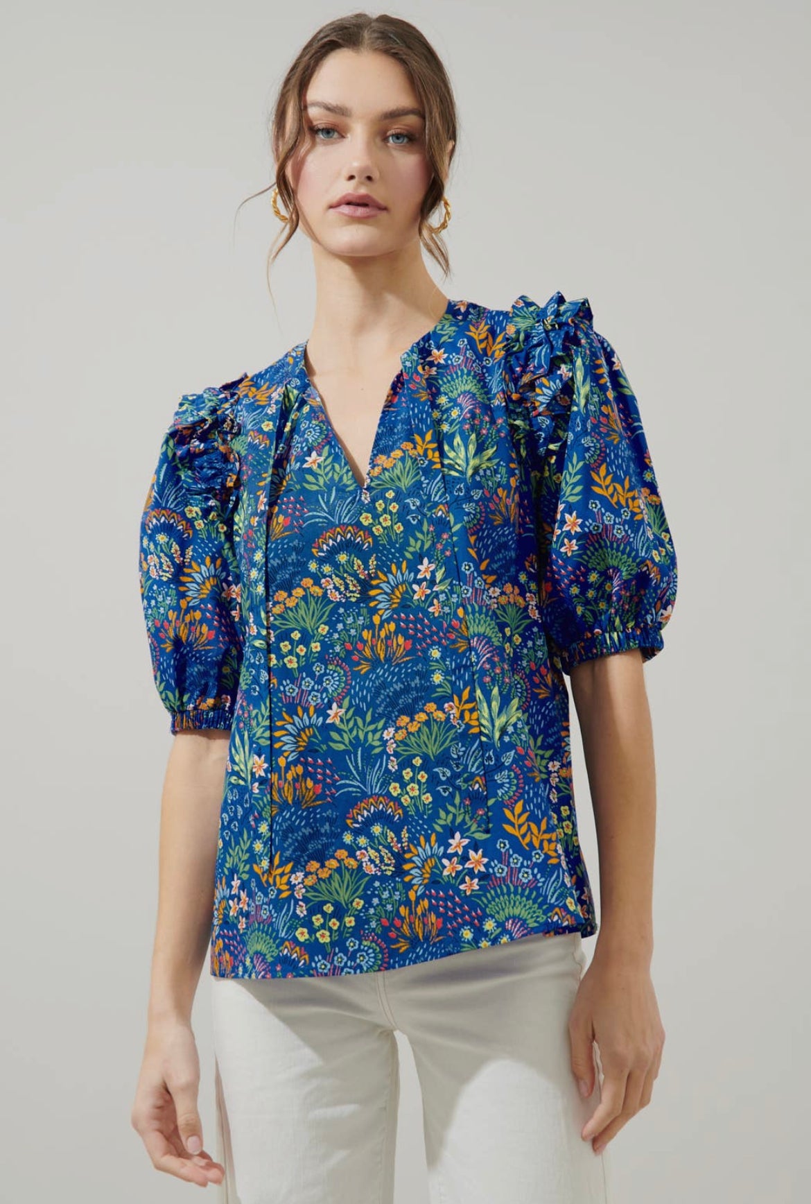 Maximal fun. Multi floral clusters work together to shape this breezy blouse. Oversized puff sleeves with ruffle trim along the shoulder frame a split neck and tie. The top maintains a relaxed fit, making it easy to style. Wear it tucked into your favorite pair of jeans, along with sandals and you're good to go!