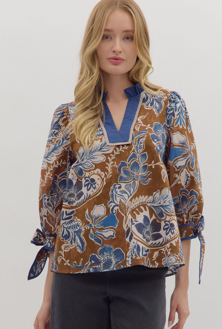 Floral print 3/4 sleeve top featuring contrast ruffled V-neck band collar and sleeve ties. Unlined. Woven. Non-sheer. Lightweight.